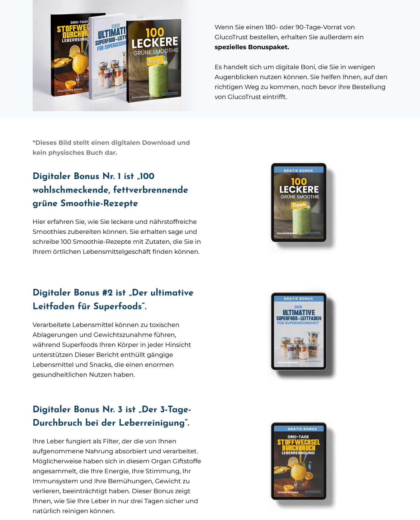 Beim Kauf des 3- oder 6-Monats-Pakets erhalten Sie Zugang zu vier digitalen Bonus-Leitfäden, die Ihren Erfolg beschleunigen sollen (z. B. “The Ultimate Guide to Superfoods”, “Drei-Tage-Leberreinigung”).