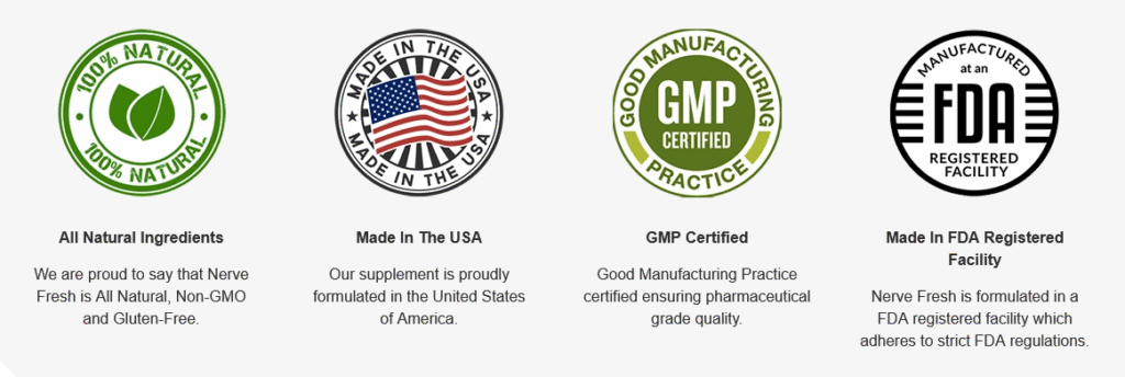 Nerve Fresh is generally considered safe as it contains natural vitamins, herbs, and antioxidants. It is manufactured in the USA in FDA-registered and GMP-certified facilities. The vast majority of users report no adverse side effects. However, if you are pregnant, nursing, under 18, or taking prescription medications, always consult your doctor before starting any new supplement.