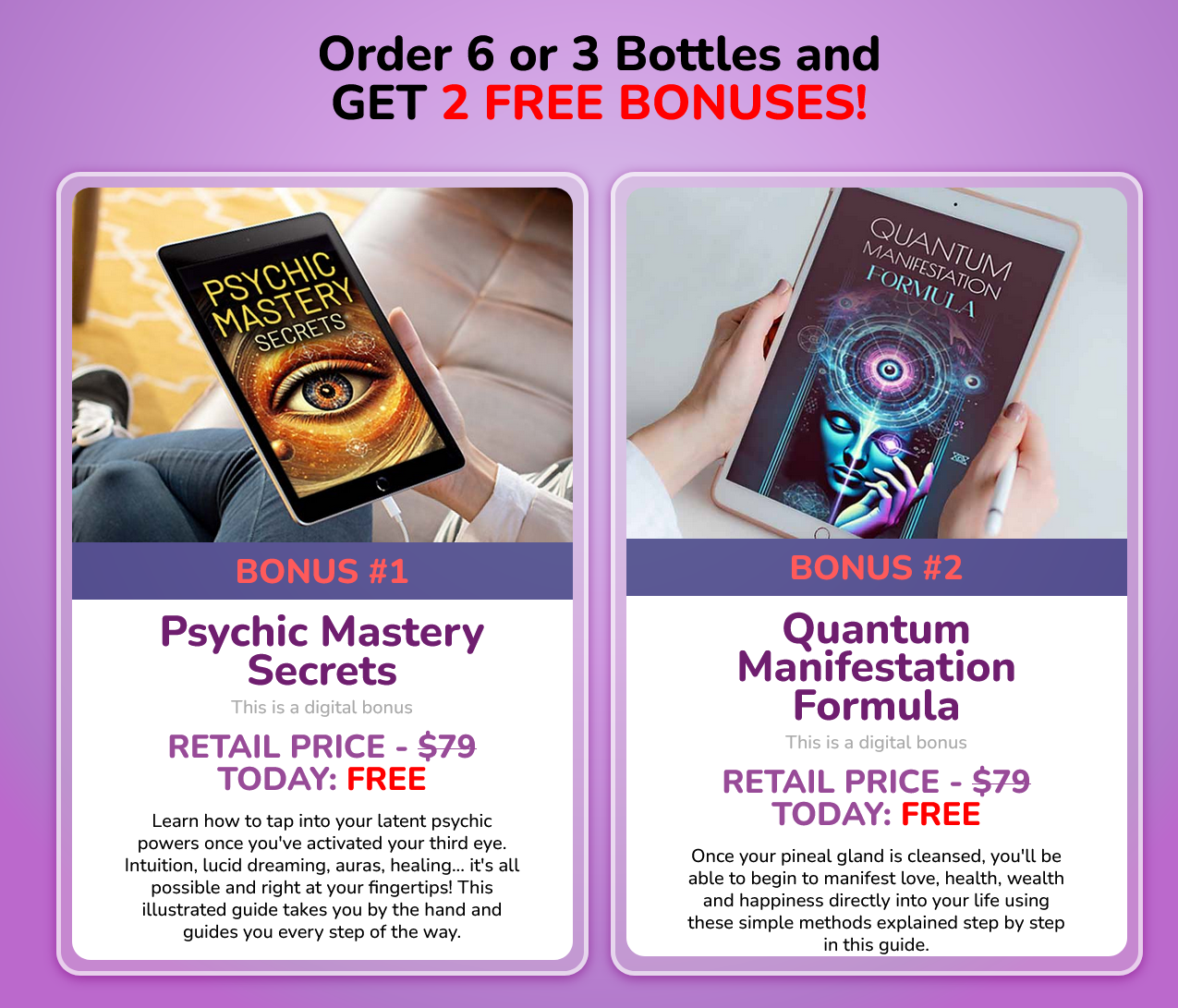 Six-Bottle Package 🏆 👉 $39 per bottle ($234 total) + FREE USA Shipping + 2 FREE Bonuses (180-day supply) Maximum value for serious commitment to pineal gland health.