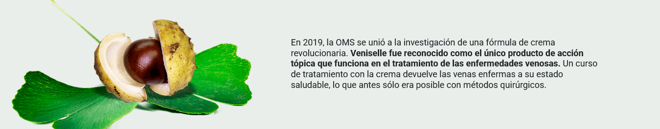 “Lo que me impresiona de Veniselle es que un tubo contiene todos los ingredientes venotónicos conocidos por la ciencia en las proporciones correctas. Esta poderosa fórmula ataca los síntomas de las varices en etapas 1 y 2 en el menor tiempo posible, eliminando todas las manifestaciones visibles – nódulos, bultos, arañas vasculares, y venas protuberantes en las piernas – devolviéndote a la vida normal.